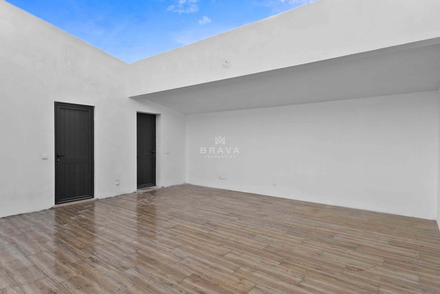 The house develops from an entrance hall, living and dining room with access to the covered outdoor area, open space kitchen with island and laundry room. The private area includes three bedrooms, all with built-in wardrobes, one of which is en suite. It also has a full bathroom, patio with seating area, interior garden, storage room and garage.