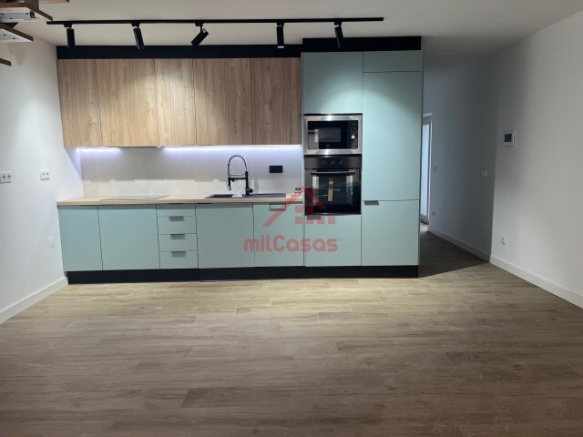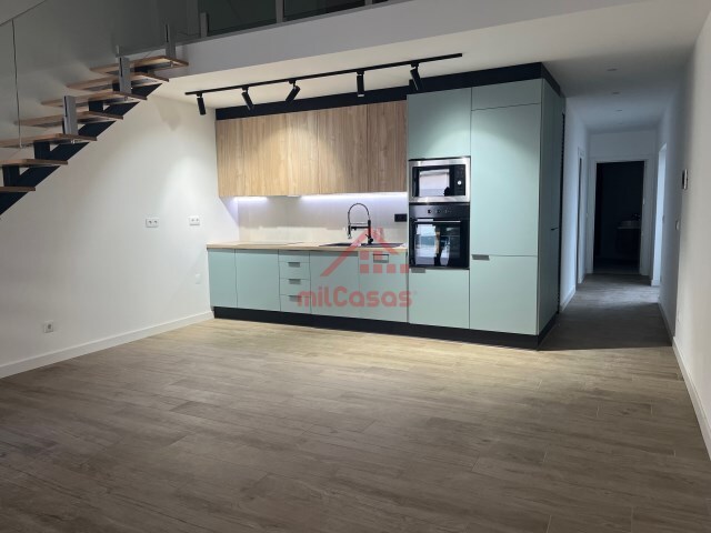 cozinha equipada com placa, exaustor, forno, micro ondas, Máquina de lavar roupa, máquina de lavar loiça, frigorífico e termo acumulador.